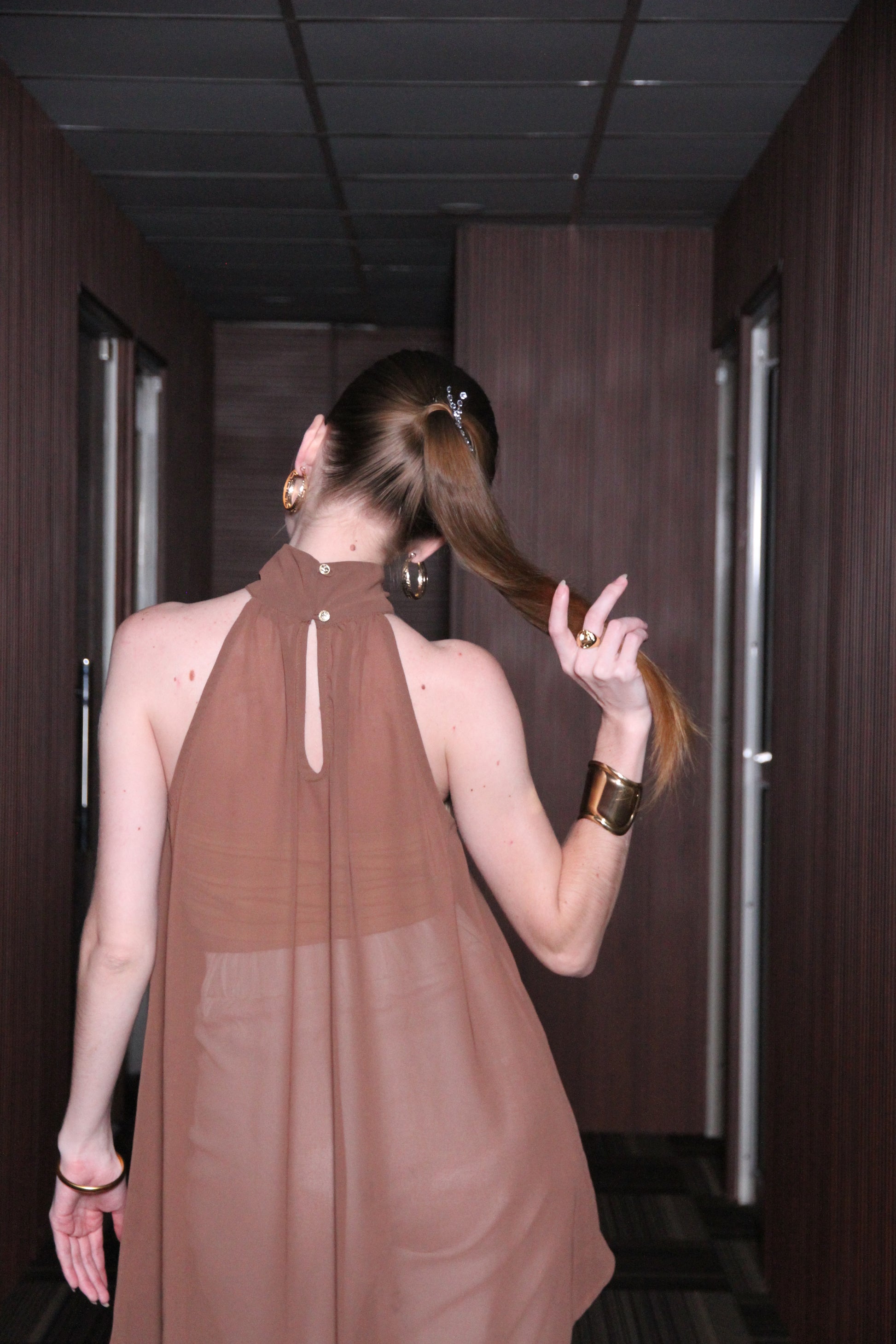 The Drift Top is a study in effortless elegance. Designed in airy georgette, it features a halter neckline and a high-low asymmetric hem that flatters every body type with graceful ease. The back is elevated with two signature gold NOIR buttons, adding a refined statement to this timeless silhouette. Versatile yet distinctive, it flows seamlessly from festive gatherings to elevated daywear.